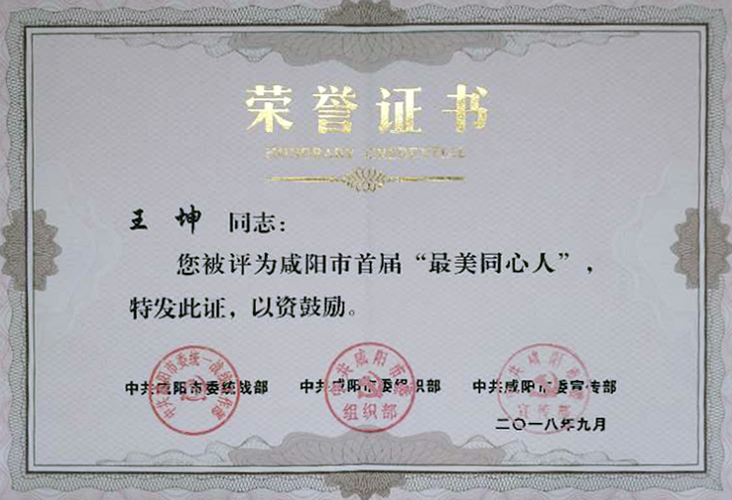 为庆祝改革开放40周年,展示风貌、宣传典型,发挥示范引领作用,咸阳市在全市统一战线领域开展“最美同心人”评选表彰活动,选举了一批民族团结进步创建活动示范单位和先进个人、创建和谐寺观教堂先进集体和先进个人、优秀中国特色社会主义事业建设者和咸阳市“最美同心人”等先进典型。9月26日晚,“践行新思想,逐梦新时代”咸阳市统一战线先进典型表彰活动在大秦剧院举行,省委统战部常务副部长陈光明,咸阳市委书记岳亮,市长卫华,市委常委马俊民、崔勒宇为先进典型代表颁奖。市委副书记马希良,市政协副主席、农工党市委会主委赵昌华,市政协副主席、民盟市委会主委王巧萍参加活动。咸阳市委常委、统战部部长李晓静致辞。我院九三学社支社主委王坤同志荣获咸阳市首届“最美同心人”称号,受到咸阳市委统战部、组织部、宣传部联合表彰。